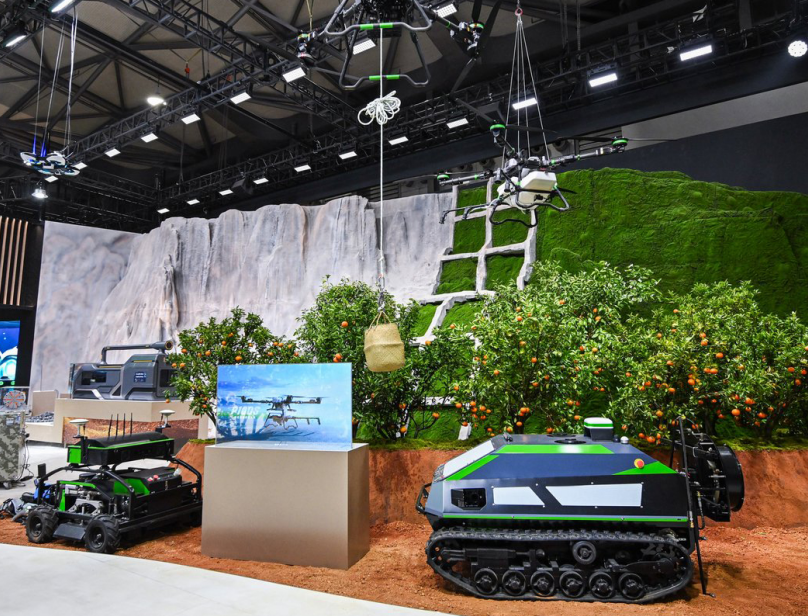 禾芯动力集中展示了包括植保无人机、吊运无人机、果园植保机器人、除草机器人、巡检机器狗以及室内巡检无人机在内的全系列产品。