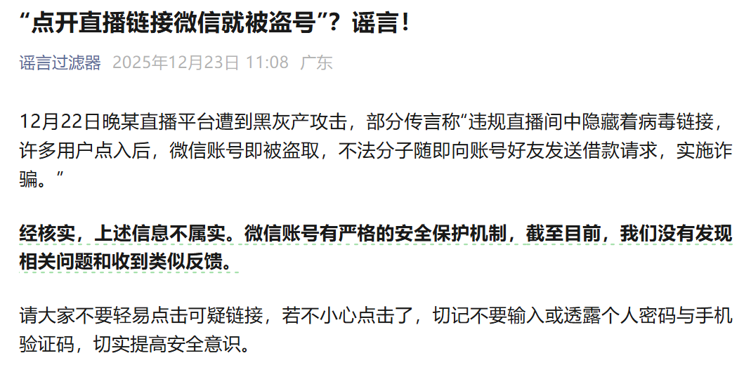 微信方面强调,请大家不要轻易点击可疑链接,若不小心点击了,切记不要输入或透露个人密码与手机验证码,切实提高安全意识。