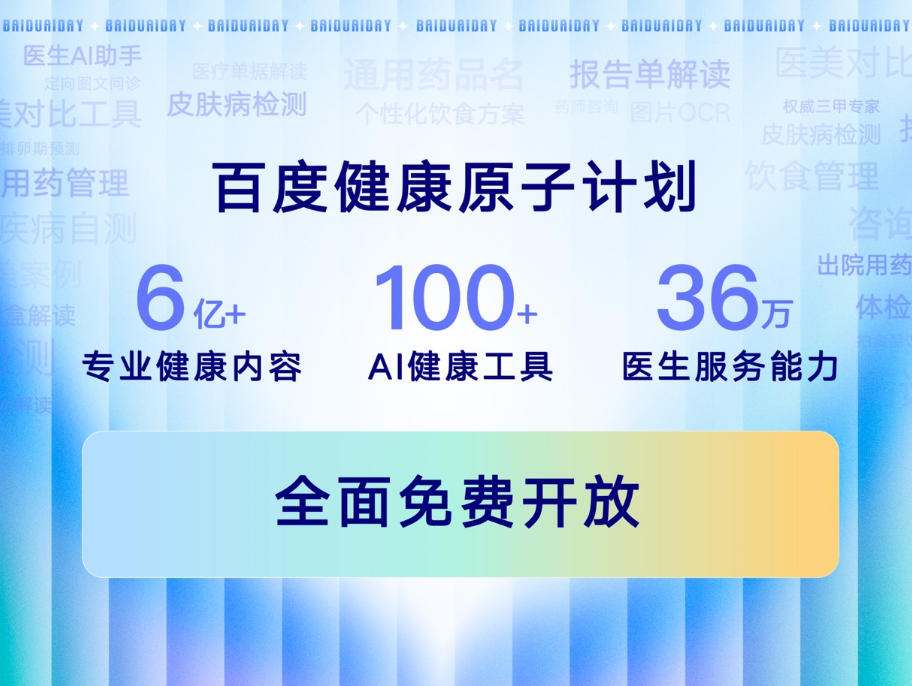 在C端服务之外,百度健康同步发布原子开放计划,以 “全面、免费” 为核心,向行业开放权威内容、医生服务和100余项AI 健康工具能力。杨明璐表示,“健康这条路很长,独行不如结伴。” 目前,政策明确提出要推动医疗卫生服务与信息技术深度融合,鼓励社会力量参与健康服务体系建设,原子计划正是对这一要求的直接实践。