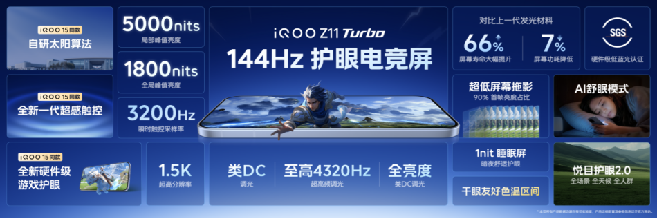 iQOO Z11 Turbo配备6.59英寸1.5K 144Hz护眼电竞屏,支持类DC调光、至高4320Hz超高频调光、全亮度类DC调光三重护眼方案,通过SGS硬件级低蓝光与低频闪认证,实现全天候、全人群、全场景护眼。