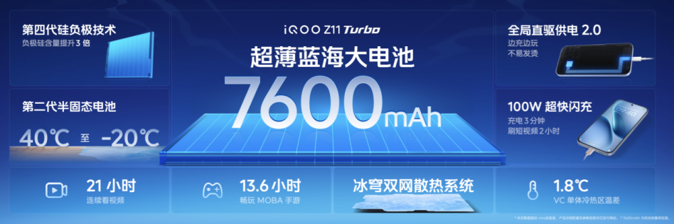 iQOO Z11 Turbo内置7600mAh超薄蓝海大电池,采用行业领先的第四代硅负极技术,能量密度达iQOO全系最高的860Wh/L,续航能力远超同尺寸性能机。配合100W超快闪充与全局直驱供电2.0技术,边玩边充不发烫、不伤电池,一杯咖啡的时间即可回血过半。