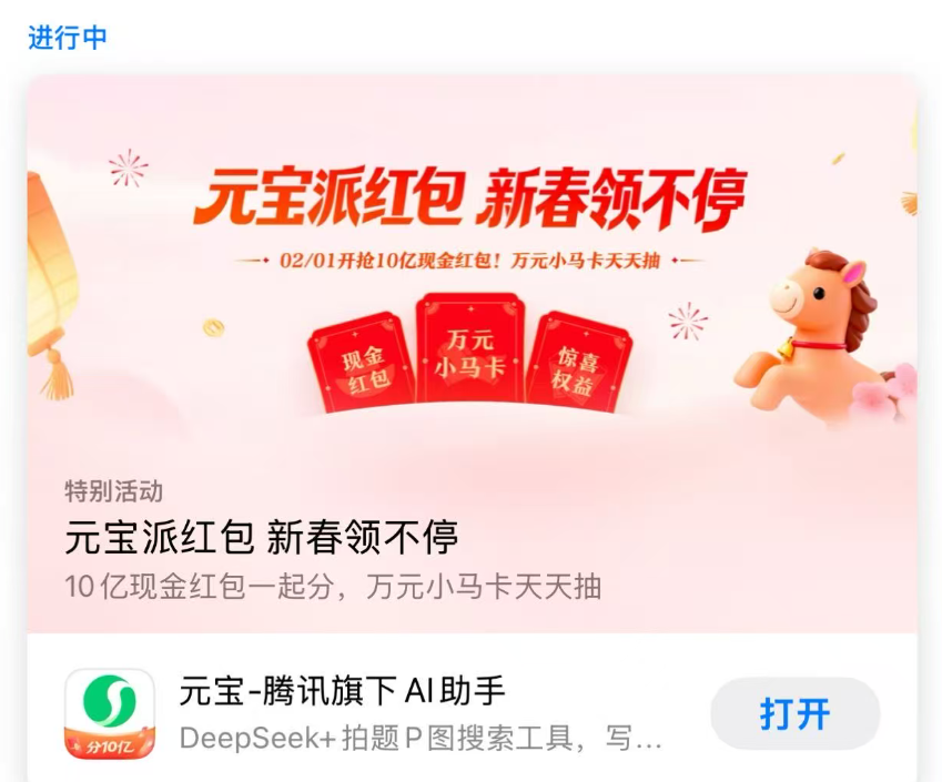此前,腾讯官方宣布推出“春节上元宝分红包”的活动,希望此举能重现11年前的微信红包时刻。据了解,此次发放总额高达10亿元,单个红包金额可达万元,用户每日登录都有一次领取机会,并于2月4日零点、2月10日零点、2月17日零点后开启上一轮的红包现金提现。