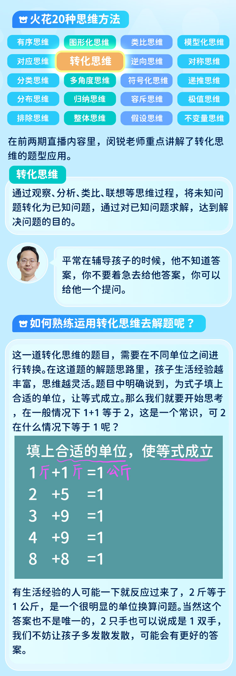 近日,火花思维资深教研针对小学生如何熟练运用“转化思维”来解题,分享了独到的教学方法和实用技巧。